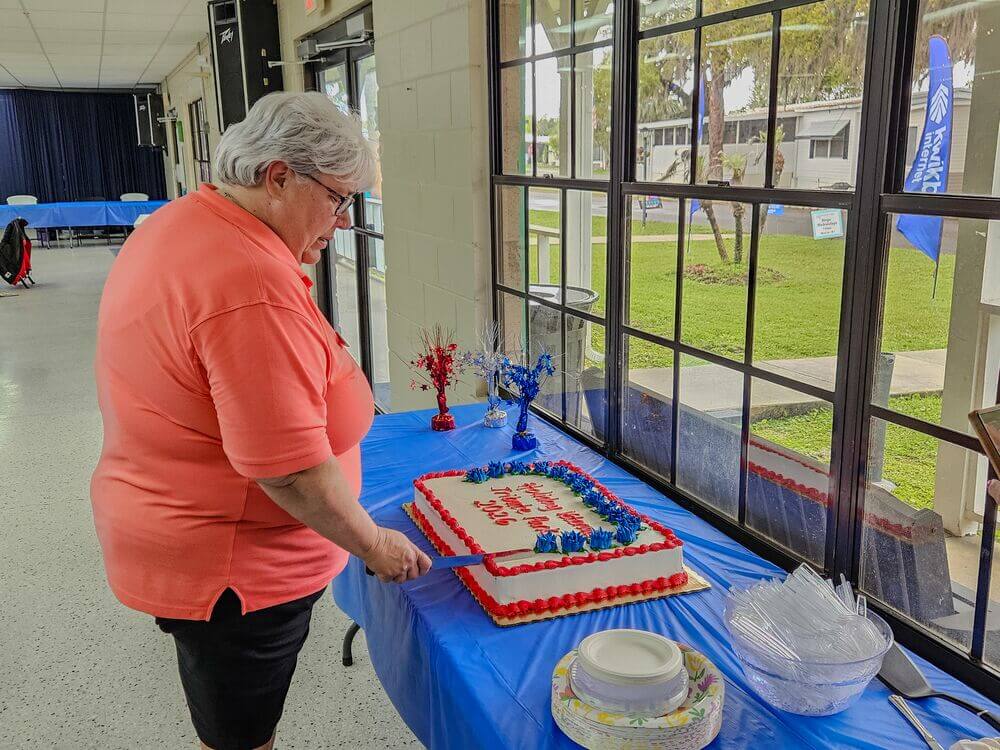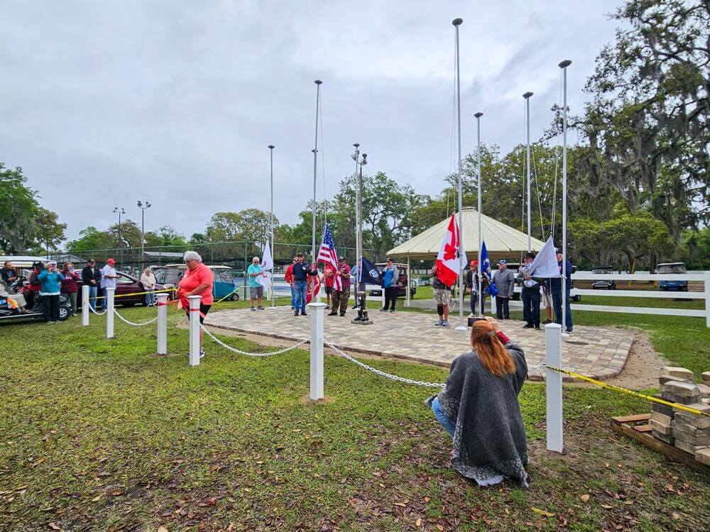 Kat Hoehne, also a veteran, runs the Annual Veteran’s Day Potluck with the Eustis High School Junior ROTC. The event even includes Canadian veterans who snowbird at Holiday RV Park, as November 11 is the Canadian Day of Remembrance. Ruthanne Arnold brings cards to each event for residents to sign and send to soldiers.